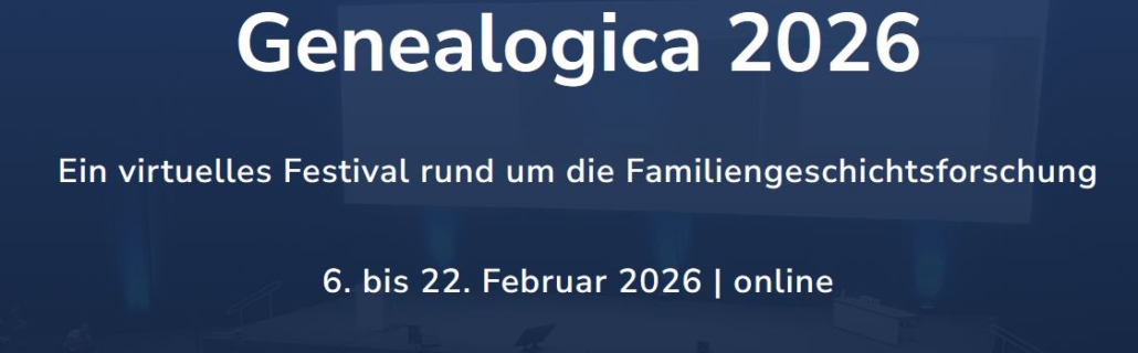 Am Freitag, den 6. Februar 2026, um 17:30 Uhr öffnet die „Genealogica 2026“ zum sechsten Mal wieder ihre Tore für ein „virtuelles Festival rund um die Familiengeschichtsforschung“. Der Verein für Computergenealogie (CompGen) ist auch diesmal wieder mit Vorträgen dabei. Die Vorträge werden aufgezeichnet und sind für die Besucher bis zum 22. Februar 2026 abrufbar. Neben dem interessanten Vortragsprogramm gibt es auch wieder virtuelle Ausstellerstände.